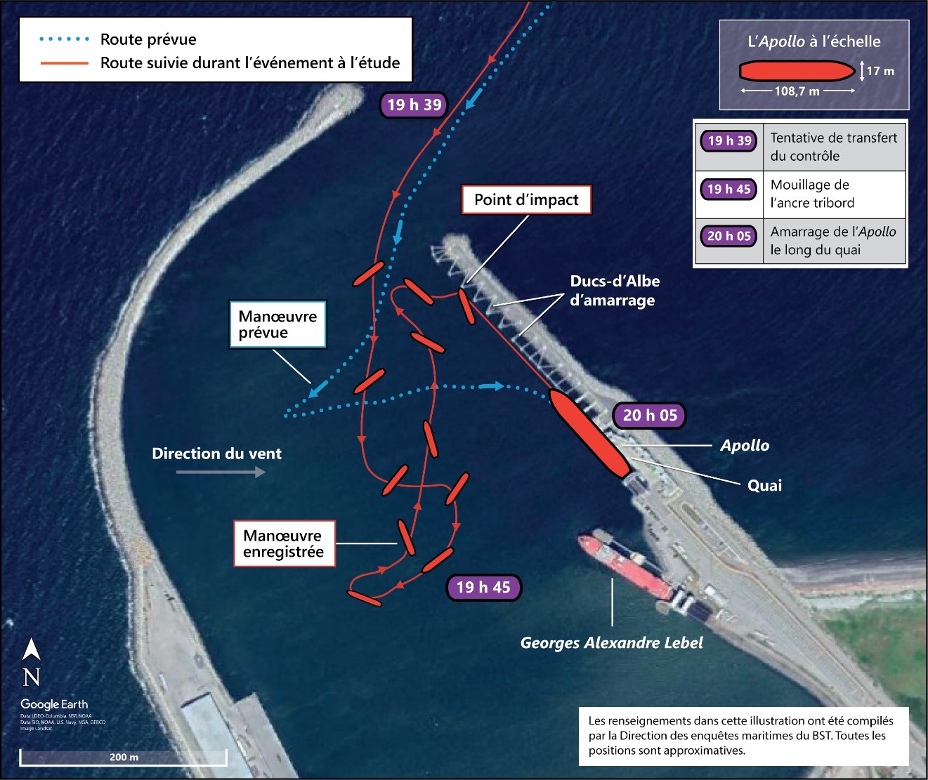Le 16 mars 2019, le traversier roulier Apollo effectuait sa traversée habituelle de Godbout (Québec) vers Matane (Québec) avec 94 personnes à bord lorsqu’il a heurté un duc-d’Albe (structure qui accroît la capacité d’accostage des navires à un quai) pendant l’accostage. Au moment de l’événement, il y avait de forts vents et il faisait noir. Durant l’accostage, le capitaine avait tenté de manœuvrer le navire à partir de la console d’aileron de passerelle tribord au moyen du moteur, du gouvernail et du propulseur d’étrave. Alors que le navire entrait au port de Matane, le capitaine avait appuyé sur le bouton de la console d’aileron de passerelle tribord afin d’y transférer le contrôle du propulseur d’étrave à partir de la passerelle, mais aucun transfert n’a eu lieu en raison d’un fil électrique cassé. Ainsi, le propulseur d’étrave ne répondait pas aux commandes du propulseur d’étrave effectuées par le capitaine lorsque le navire était au port. Le navire a subi des avaries en raison du heurt et été retiré du service. Aucune pollution ni blessure n’ont été signalées.