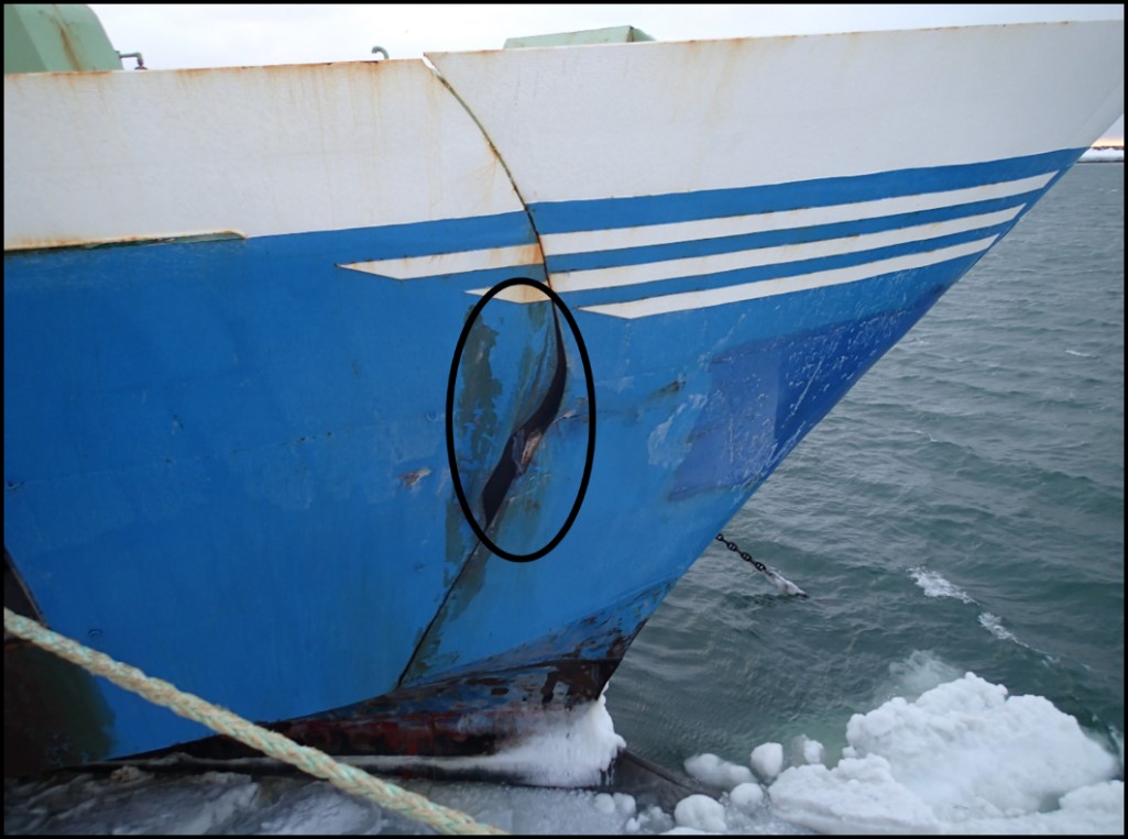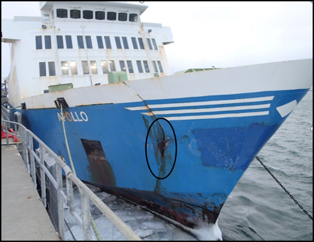 L’Apollo a été endommagé là où la visière d’étrave et la coque se joignent (figures 4 et 5). Le bordé extérieur a été enfoncé et déformé sur approximativement 1 m, ce qui a créé une brèche entre la visière et la coque atteignant environ 0,3 m de large à son maximum. Il y a également eu un flambage de la structure autour de la brèche. Le 19 mars 2019, la STQ a définitivement retiré l’Apollo du service en raison des avaries causées par le heurt.