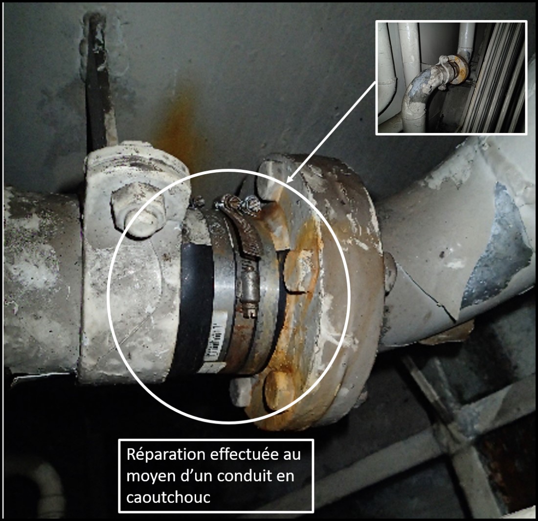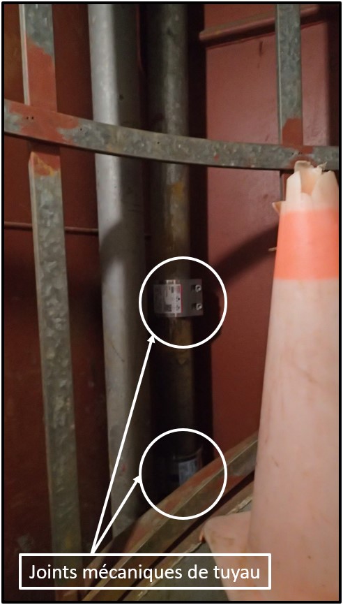 - Certaines sections du collecteur d’incendie étaient corrodées et fuyaient, et plusieurs réparations au moyen de placards à joint plastique et de joints mécaniques de tuyau y avaient été effectuées (figure G10). L’une des sections du collecteur d’incendie fuyait dans l’escalier situé entre les ponts 2 et 3 (figure G11).