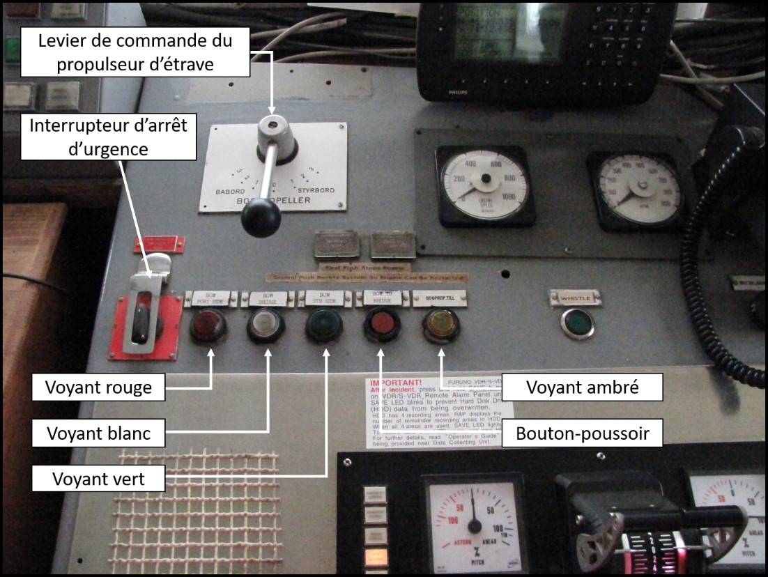 Pendant qu’elle surveillait toujours l’ampèremètre du propulseur d’étrave, l’équipe de la salle des machines a remarqué que l’instrument n’indiquait aucune consommation électrique pendant la manœuvre, et le chef mécanicien a appelé l’équipe de la passerelle afin de demander si le propulseur d’étrave était utilisé. Le timonier a pris l’appel et, après avoir constaté que les voyants blanc et ambré du propulseur d’étrave étaient allumés sur la console de passerelle, il a répondu par l’affirmative. L’activation de ces 2 voyants indique que le propulseur d’étrave est activé et qu’il est commandé depuis la console de passerelle.