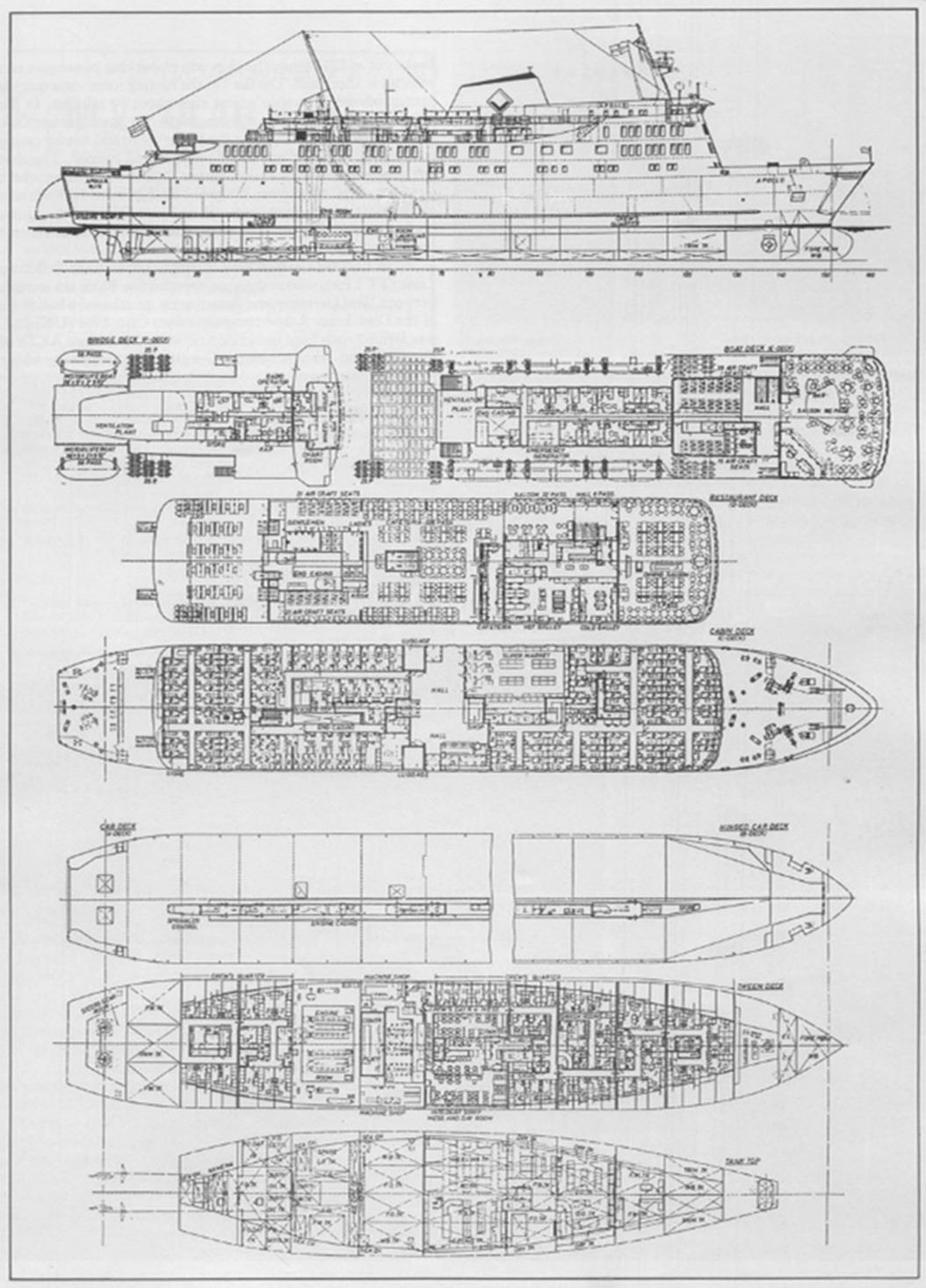 Le navire était conçu à l’origine pour accueillir 1200 personnes et comptait 222 cabines passagers. Au moment de l’événement, les cabines n’étaient plus utilisées et avaient été verrouillées afin d’empêcher les passagers d’y accéder. Les points d’accès des cabines avaient également été bloqués.