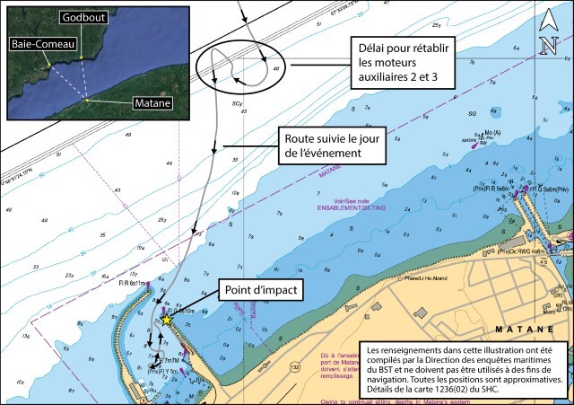 À 19 h 03, le capitaine a appelé le personnel de la STQ, à Matane, pour se renseigner sur la vitesse du vent dans le port; on lui a répondu qu’il soufflait plus fort qu’initialement prévu lors du départ et que sa vitesse atteignait maintenant entre 35 et 40 nœuds. À 19 h 08, alors que le navire se trouvait à environ 2 NM de Matane, l’équipe de la salle des machines a appelé le capitaine pour lui signaler que 2 groupes électrogènes s’étaient arrêtés automatiquement lorsque leurs capteurs de surchauffe s’étaient activés en raison du blocage de l’une des crépines d’une conduite de refroidissement par des algues et des débris. L’équipe de la salle des machines, laquelle avait maintenu le 3e groupe électrogène en marche en effectuant une commutation vers l’autre crépine de la conduite de refroidissement, a demandé au capitaine de lui accorder un certain temps pour régler le problème avant de procéder à l’amarrage à Matane (annexe D).