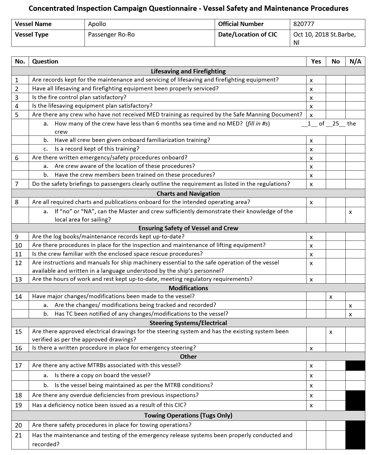Annexe F – Résultats de l’inspection de l’Apollo réalisée dans le cadre de la campagne d’inspection concentrée de 2018 axée sur les procédures de sécurité et d’entretien des navires (en anglais seulement)