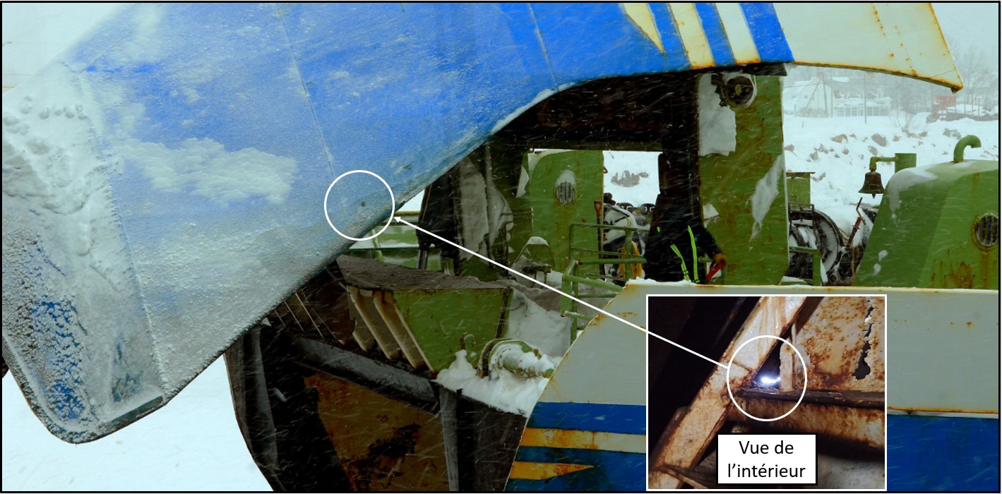 - La rouille avait percé une brèche d’environ 2 cm de largeur sur 1 cm de hauteur dans le bordé de la visière d’étrave. De la rouille et de la corrosion étaient visibles autour de la brèche (figure G1).