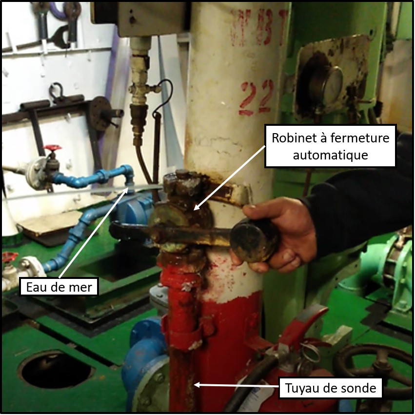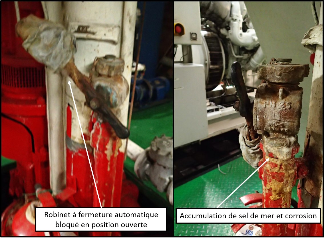 - Les robinets à fermeture automatique de 2 des tuyaux de sonde des réservoirs à double fond étaient bloqués en position ouverte par de la rouille et des résidus de sel (figure G2).