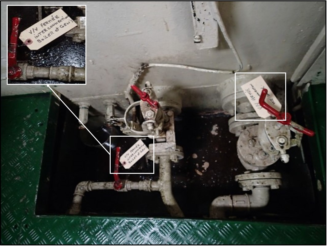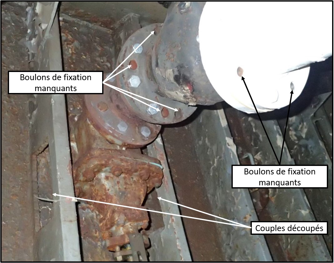 - Il manquait certains des boulons de fixation des vannes de coque au sein de celles servant à évacuer l’eau de mer par-dessus bord (figure G4).