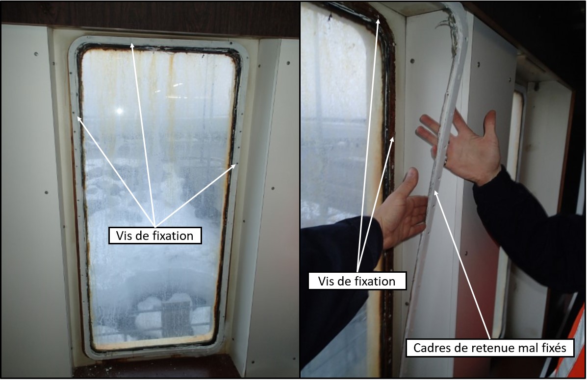 - Les cadres d’aluminium servant à fixer les fenêtres de verre trempé situées sous le point d’envahissement du navire étaient corrodés autour des trous de vis et, par endroits, ils n’étaient plus rattachés à la structure qui les entourait (figure G5).