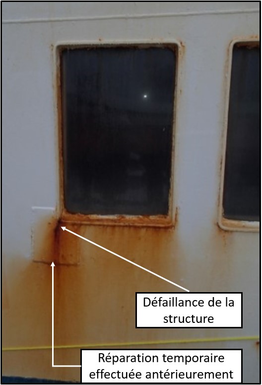 - La superstructure du navire était fissurée sur environ 10 cm, à partir du coin inférieur de l’une des fenêtres (figure G6). À un certain moment, une plaque avait été soudée sur la fissure, réparation temporaire qui ne s’avérait toutefois plus efficace.