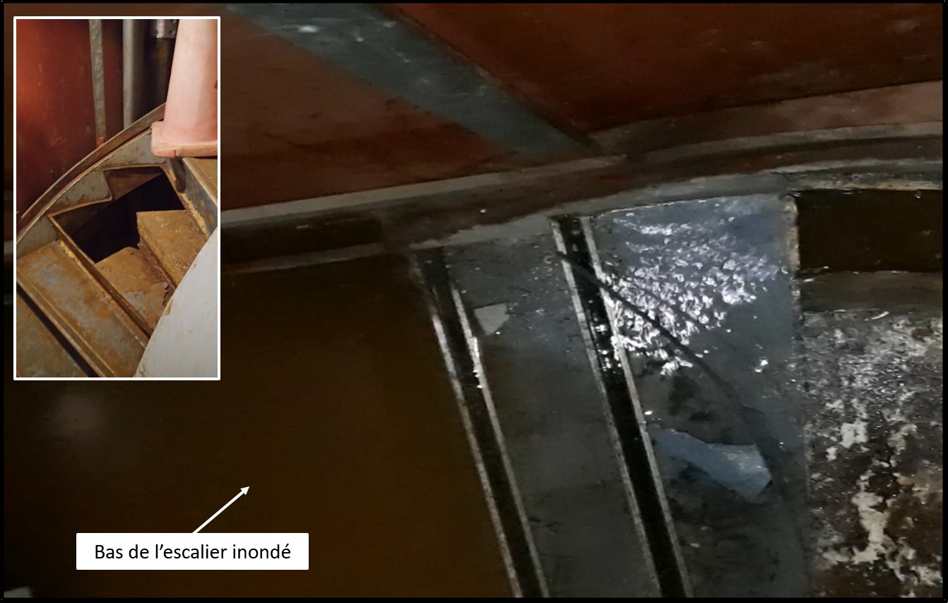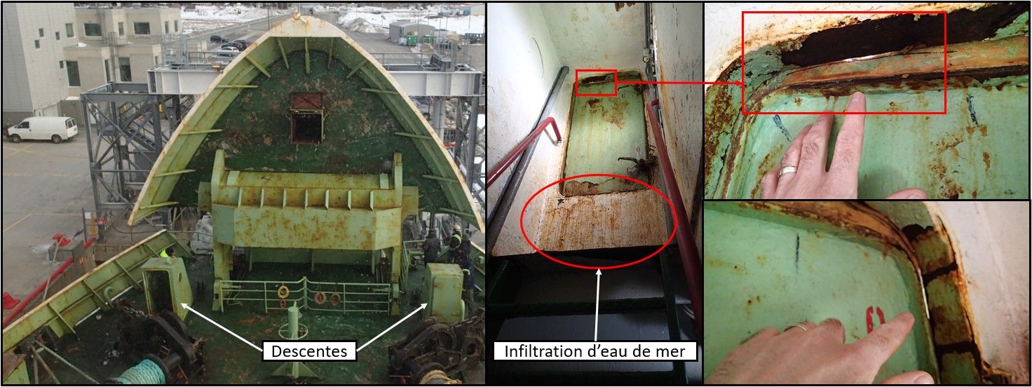 - Les cadres de porte et les portes des descentes du pont avant n’étaient plus étanches à l’eau en raison de la rouille et de la détérioration de joints d’étanchéité (figure G7).
