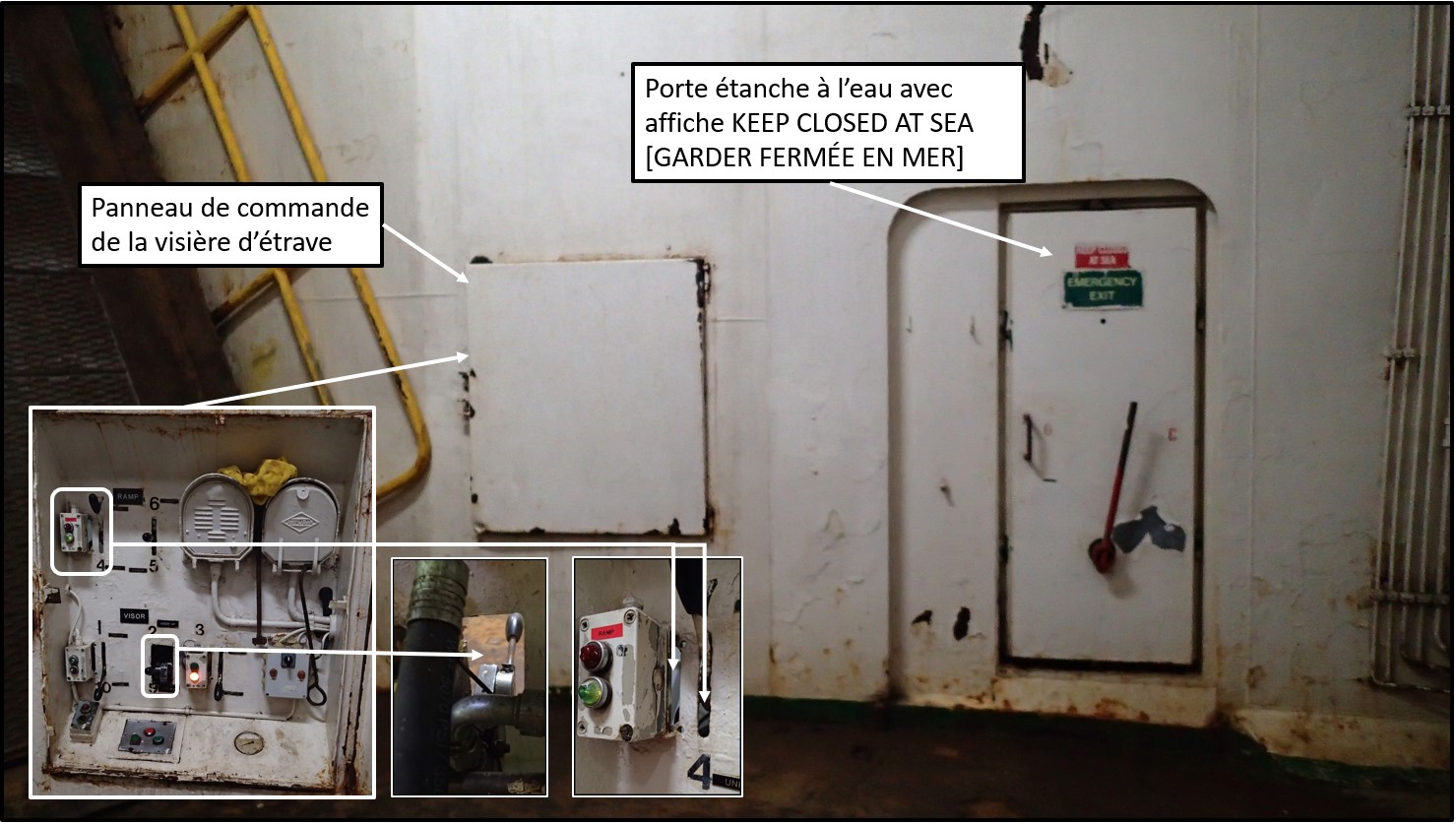 - L’une des 2 pompes hydrauliques actionnant les portes coulissantes hydrauliques étanches à l’eau des ponts 1 et 2 ne fonctionnait pas. La pompe hors service faisait partie de l’équipement essentiel du navire et devait être alimentée par le tableau de distribution d’urgence en cas de panne. La pompe qui fonctionnait n’était pas alimentée par le tableau de distribution d’urgence et ne fonctionnait que de façon intermittente en raison d’un problème continu posé par son fusible.