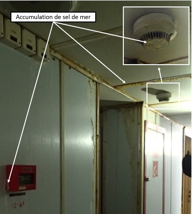 - Certains détecteurs d’incendie et de fumée installés dans les environs du collecteur d’incendie, dans le plafond du pont 2, avaient été endommagés par de l’eau de mer (figure G9).