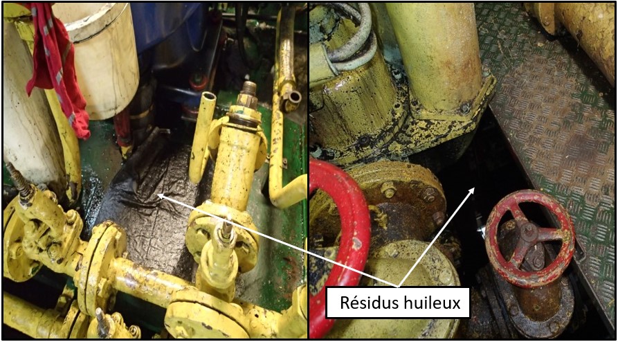 - Des résidus huileux, des chiffons contaminés et des tampons d’absorption d’huile reposaient un peu partout dans les salles des machines principales et auxiliaires, y posant tous un danger d’incendie (figure G14).