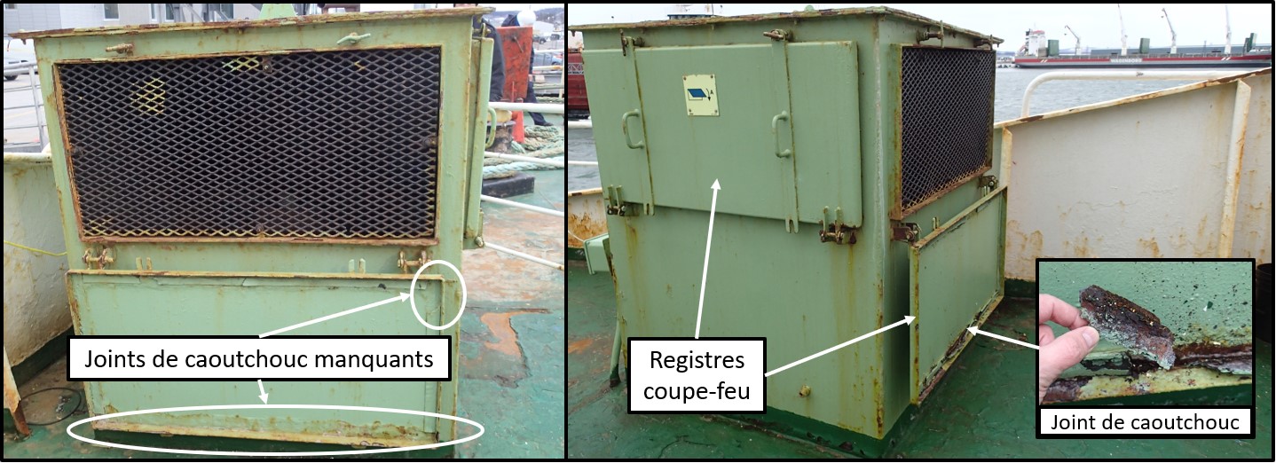 - Certains des joints de caoutchouc entourant les registres coupe-feu des conduits d’entrée d’air du navire n’étaient plus étanches à l’air lorsque les registres étaient fermés (figure G16).