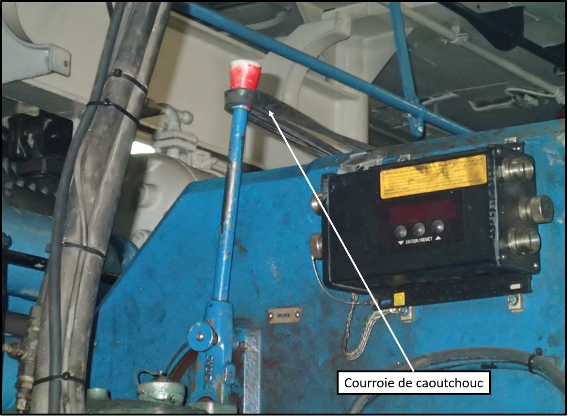 - Le levier d’arrêt du moteur principal bâbord était maintenu en place par une courroie de caoutchouc (figure G22).