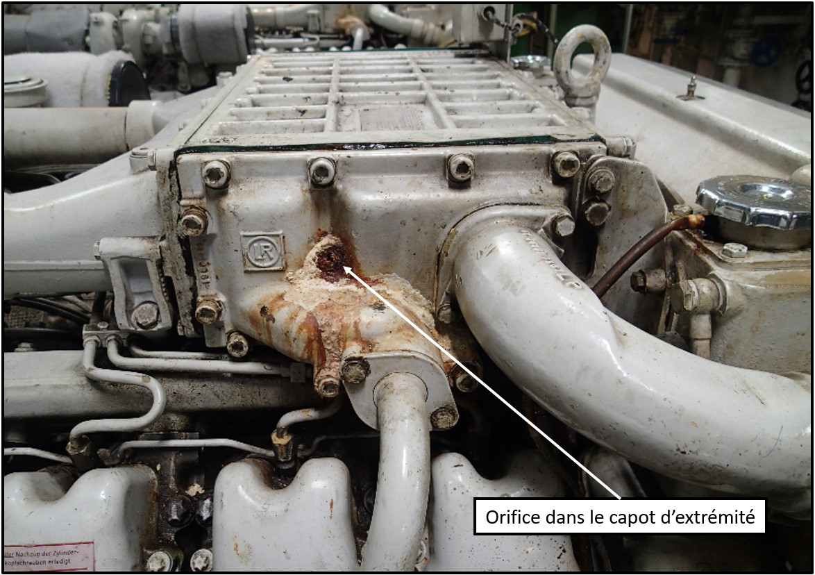 - Perforations par corrosion des capots d’extrémité des refroidisseurs intermédiaires des 3 moteurs diesels auxiliaires, et ces trous étaient entourés de rouille et de résidus de sel là où de l’eau de mer avait fui. Les refroidisseurs intermédiaires se servent de l’eau de mer pour abaisser la température de l’air d’entrée acheminé depuis le turbocompresseur jusque dans les cylindres afin d’accroître le rendement des moteurs (figure G23).