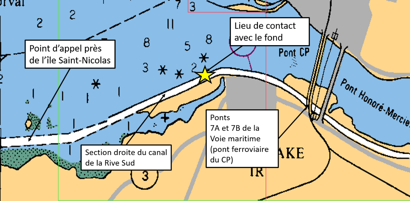 Pendant ce temps, le Kaministiqua s’approchait des ponts 7A et 7B de la Voie maritime à une vitesse de 5,9 nœuds, puis il est passé sous les ponts à 6 h 34. Peu avant 6 h 44, alors qu’il sortait de la courbe, le navire s’est approché de la rive nord et a ensuite dévié vers le centre du canal. Pour corriger l’écart, le Kaministiqua a modifié sa trajectoire à tribord à 6 h 46 min 18 s.