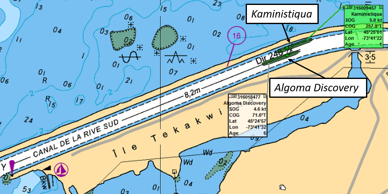 Alors que l’Algoma Discovery se dirigeait en aval en tant que navire privilégié (c’est-à-dire qui suit le courant) le long du canal de la Rive Sud, il était tenu de proposer au Kaministiqua des dispositions de rencontre et de croisement. Même si les capitaines des deux navires avaient convenu d’un lieu de passage, ils n’ont pas révisé ou mis à jour le plan quand il est devenu évident qu’ils n’allaient pas se rencontrer à l’endroit convenu.