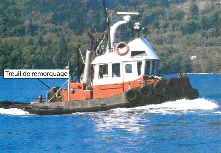 Le Sheena M était un remorqueur à coque d’acier muni de 2 hélices d’une jauge brute de 9,99 qui a été construit en 1981. Son propriétaire et représentant autorisé était Active Marine Towing Ltd. (figure 1). Le remorqueur était alimenté de 2 moteurs diesel d’une puissance totale de 447 kW et était muni d’un treuil de remorquage situé à l’arrière de l’axe longitudinal. Le Sheena M, qui était habituellement utilisé pour remorquer des estacades flottantes, a également servi à remorquer des chalands de la série 500 de Seaspan à maintes reprises. L’équipage du bateau était constitué d’un capitaine et d’un matelot de pont.