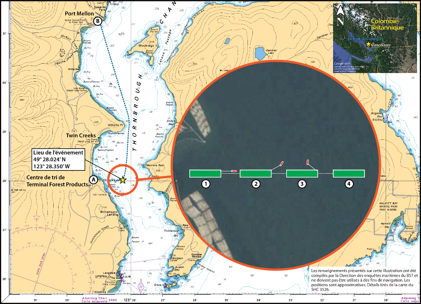 Vers environ 12 h 37, le remorqueur tirant le chaland a quitté les installations de Terminal Forest Products à une vitesse approximative de 2 nœuds et a parcouru une distance d’environ 180 m dans le chenal. Peu après être sorti par la barrière de sécurité du terminal, qui consistait en 2 bouées cylindriques, le capitaine a effectué un virage à bâbord pour se diriger vers le nord en direction de Port Mellon. Le chaland n’a pas suivi le changement de cap, ce qui a fait en sorte que le remorqueur a été engagé par le chaland et a gîté sur tribord. Le capitaine a ralenti la vitesse du remorqueur, et ce dernier s’est redresséNote de bas de page 1.
