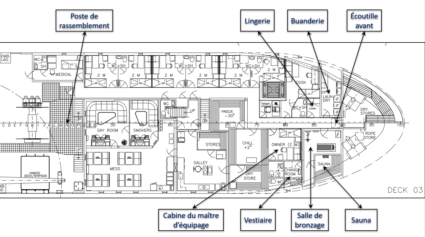 Lorsque le maître d’équipage a ouvert la porte du sauna, le membre d’équipage qui l’accompagnait a vidé l’extincteur sur les flammes. Le maître d’équipage a ensuite fermé la porte du sauna et s’est rendu au poste de rassemblement, situé au‑dessus du pont de chalutage, sur le pont 03 (figure 4), en compagnie du membre d’équipage.