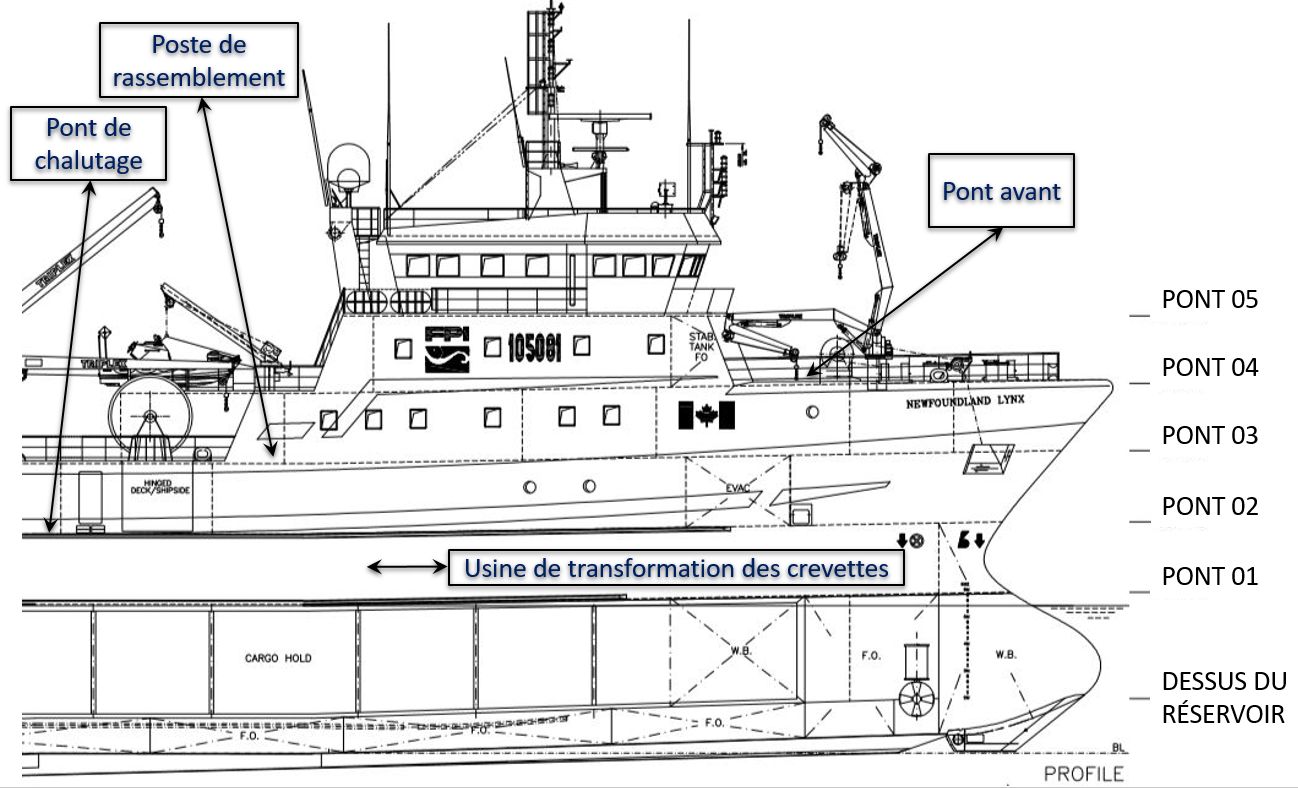 Le Newfoundland Lynx (numéro OMI [Organisation maritime internationale] 9158202, figure 1), exploité par Ocean Choice International, est un chalutier arrière à une seule hélice d’une jauge brute de 2409, construit en 2003 pour la pêche à la crevette sur la côte est du Canada. Le navire en acier soudé est équipé pour la transformation et l’entreposage des crevettes, ayant des congélateurs à bord. La passerelle et les quartiers de l’équipage sont à l’avant, l’usine de transformation des crevettes est sur le pont 01 et la salle des machines est à l’arrière. La passerelle est équipée d’un radiotéléphone à très haute fréquence, d’un téléphone satellite et d’un panneau de commande pour le système de sonorisation du navire. La construction originale du navire comprenait un sauna et une salle de bronzage sur le pont 03.