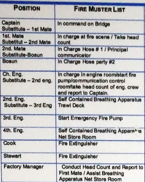 | Factory Manager | Conduct Head Count and Report to First Mate / Assist Breathing Apparatus Net Store Room |