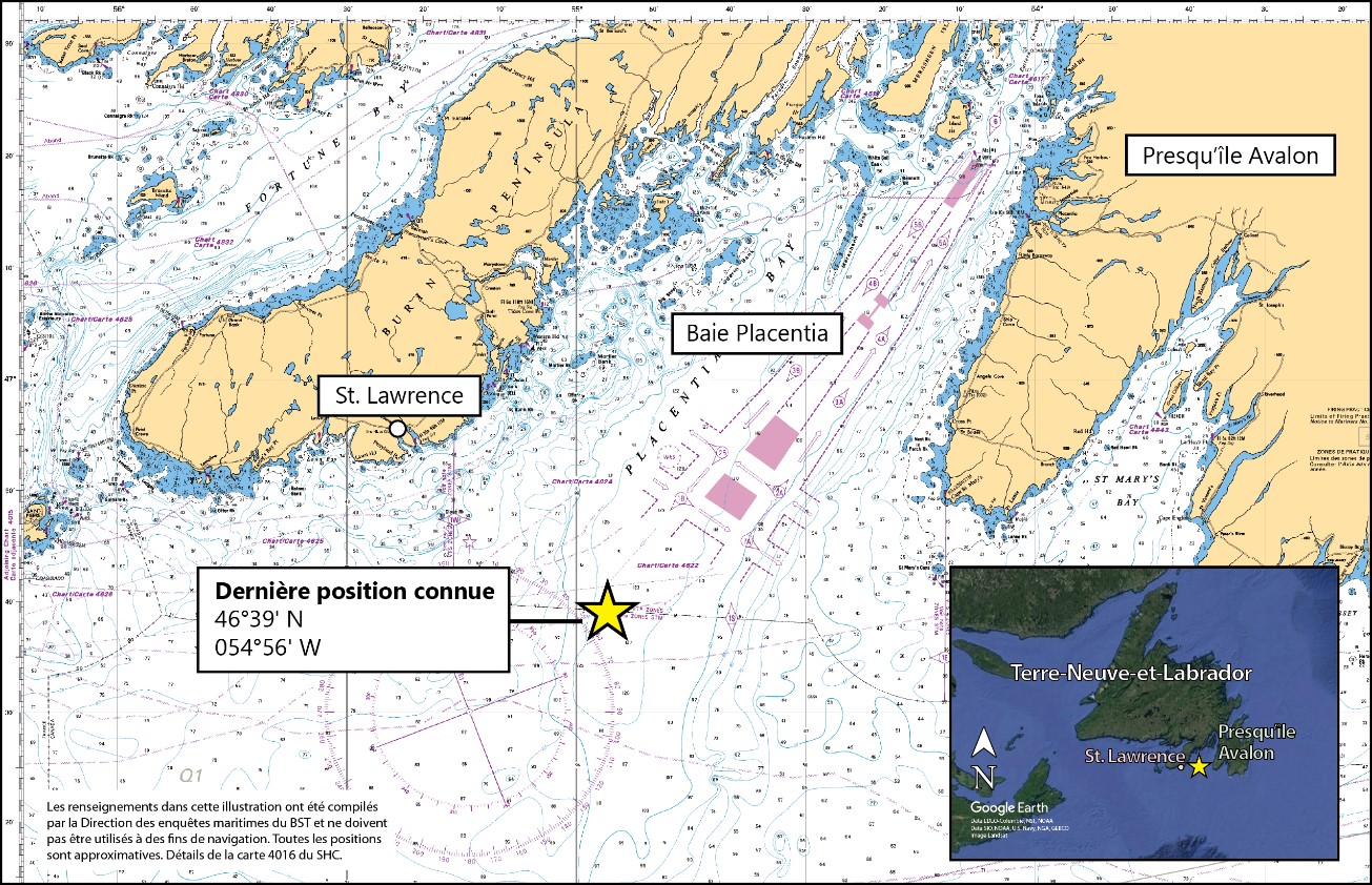 Le 25 mai 2020, à environ 0 h 12Note de bas de page 4, le Sarah Anne a quitté St. Lawrence (Terre-Neuve-et-Labrador) chargé de 453 kg de glace, en direction des lieux de pêche au crabe des neiges dans la baie Placentia. L’équipage du bateau était composé de 1 capitaine et 3 membres d’équipage. Il s’agissait du 3e et dernier voyage planifié par l’équipage dans le but de pêcher les 1500 kg de crabe des neiges restant au quota de 2020.
