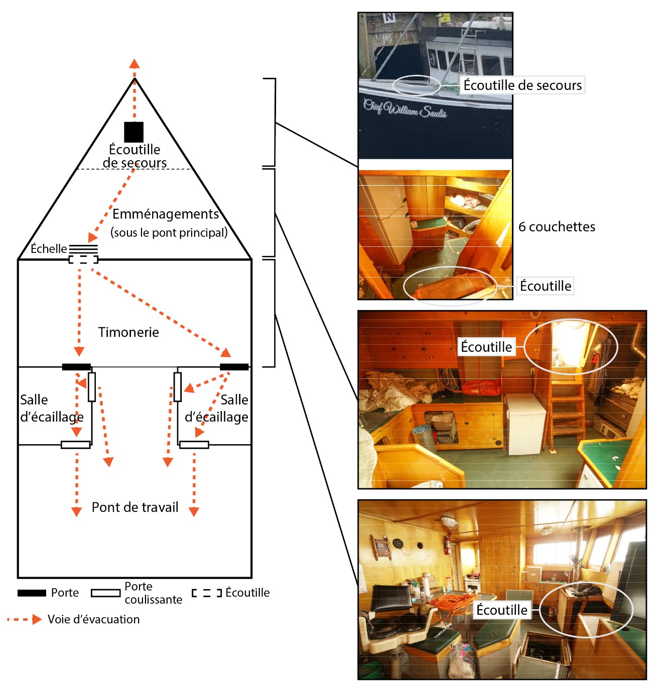 À partir des emménagements, les 2 moyens d’évacuation consistaient à monter par une échelle jusqu’à la timonerie ou à passer par l’écoutille de secours pour sortir sur le pont avant. À partir de la timonerie, les 2 moyens d’évacuation étaient les portes menant aux salles d’écaillage. À partir des salles d’écaillage, les 2 moyens d’évacuation étaient des portes coulissantes donnant sur le pont de travail, soit 1 porte arrière et 1 porte intérieure. Pour les fermer, il fallait faire glisser les portes arrière vers l’axe longitudinal du navire et les portes intérieures vers l’avant.