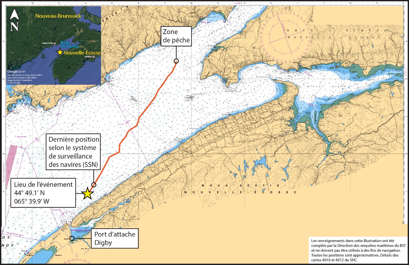 Le 15 décembre 2020, le navire de pêche Chief William Saulis revenait de la pêche au pétoncle lorsque le Centre conjoint de coordination des opérations de sauvetage d’Halifax (Nouvelle-Écosse) a reçu un signal de sa radiobalise de localisation des sinistres (RLS), à 12 milles marins au NNE de Digby (Nouvelle-Écosse). Les activités de recherche et de sauvetage ont été lancées après qu’il s’est avéré impossible de joindre le navire par radio à très haute fréquence (VHF) ou par téléphone. Le corps d’un membre d’équipage a été retrouvé; au mois de décembre 2022, les 5 autres membres d’équipage étaient toujours portés disparus. Le 16 janvier 2021, le navire a été localisé près de l’endroit où la RLS s’est activée, gisant par 66 m de fond.