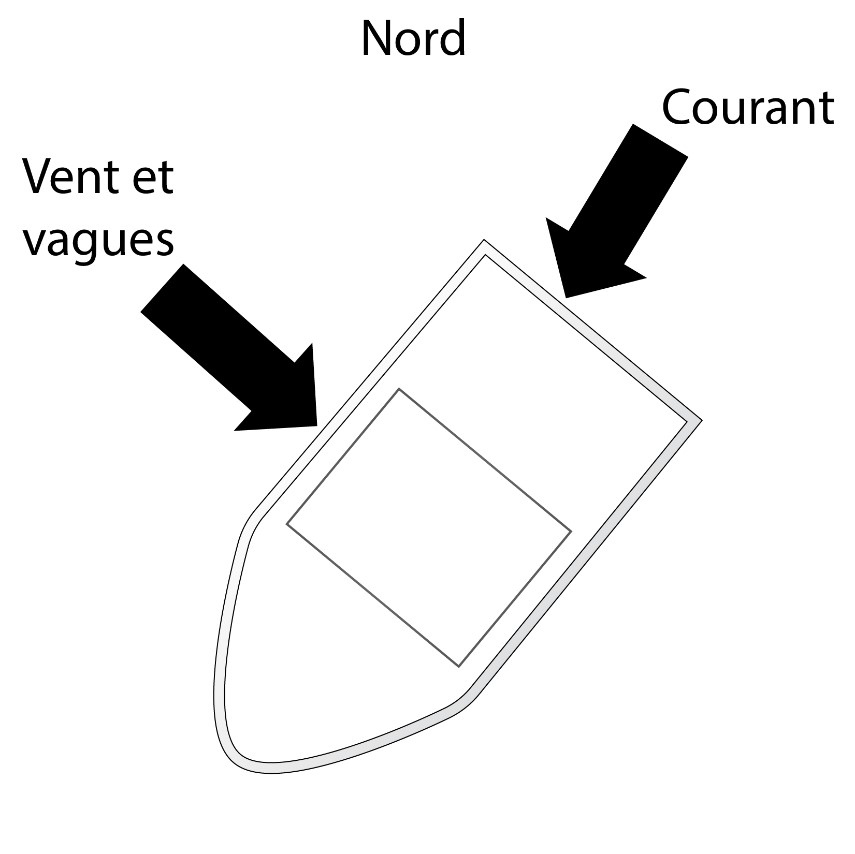 - Les conditions environnementales ont augmenté le risque de perte de stabilité. Les vagues mesuraient plus de 2 m de haut alors que le courant et le vent venaient respectivement du 212° magnétique et du 305° magnétique, créant ainsi une mer de travers qui augmentait considérablement les mouvements de roulis et le risque de chavirement.