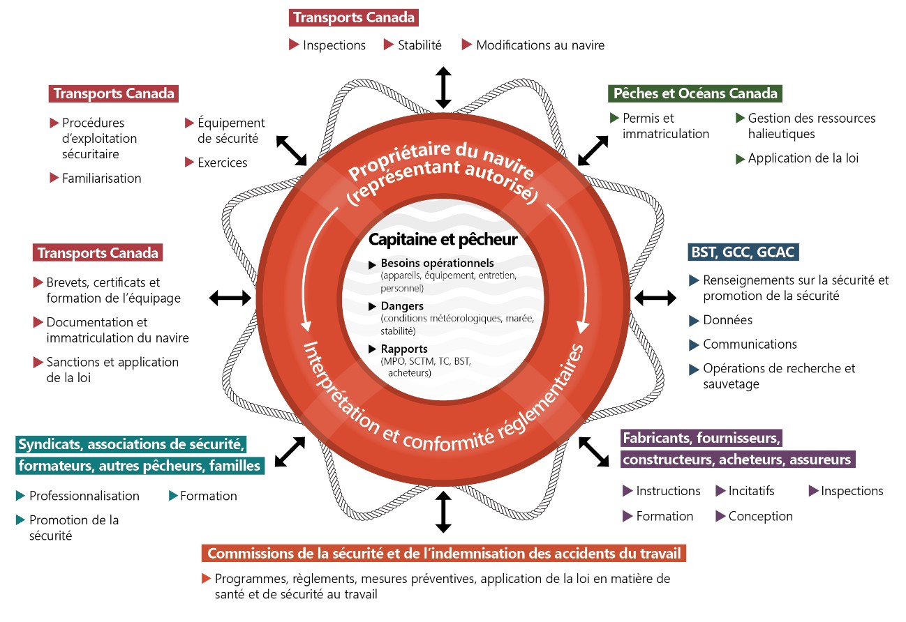 La sécurité en milieu de travail des équipages, lorsqu’ils se livrent à la pêche, relève principalement de la compétence provinciale. Le ministère provincial responsable de la santé et de la sécurité au travail a un rôle à jouer dans l’établissement et la clarification des responsabilités du propriétaire et des employés. Il lui incombe de les aider à s’acquitter de leurs responsabilités et d’intervenir de façon appropriée lorsque ces responsabilités ne sont pas exercées.