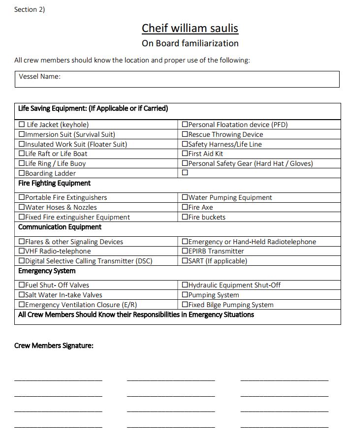L’enquête a permis de déterminer que le formulaire le plus souvent rempli était le registre du personnel : sur 3 navires et au cours d’une période de 3 ans, 15 registres du personnel ont été remplis. En comparaison, 5 formulaires de dossier d’entretien, 3 listes de vérification relatives à la familiarisation, 4 formulaires d’exercice d’urgence et 2 registres de certification des membres d’équipage ont été remplis pour ces navires. Aucun document n’était disponible pour le Chief William Saulis.