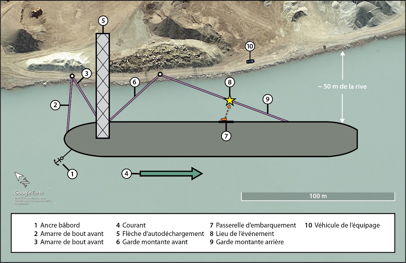 Le 12 mai 2020, vers 15 hNote de bas de page 5, le Manitoulin s’approchait d’une installation riveraine près de Sombra (Ontario), pour décharger de la pierre et effectuer un transfert d’équipage (annexe A). À cette installation, il n’y a pas de quai, mais il y a des chaînes d’amarrage à terre afin de faciliter l’amarrage des naviresNote de bas de page 6. Alors que le Manitoulin s’approchait de l’installation, le bateau de travail a été mis à l’eau pour aider à transférer les amarres en acier du navire à terre. Le Manitoulin s’est donc positionné à environ 50 m de la rive, parallèlement à celle-ci, et a maintenu cette position pendant qu’on attachait les amarres.