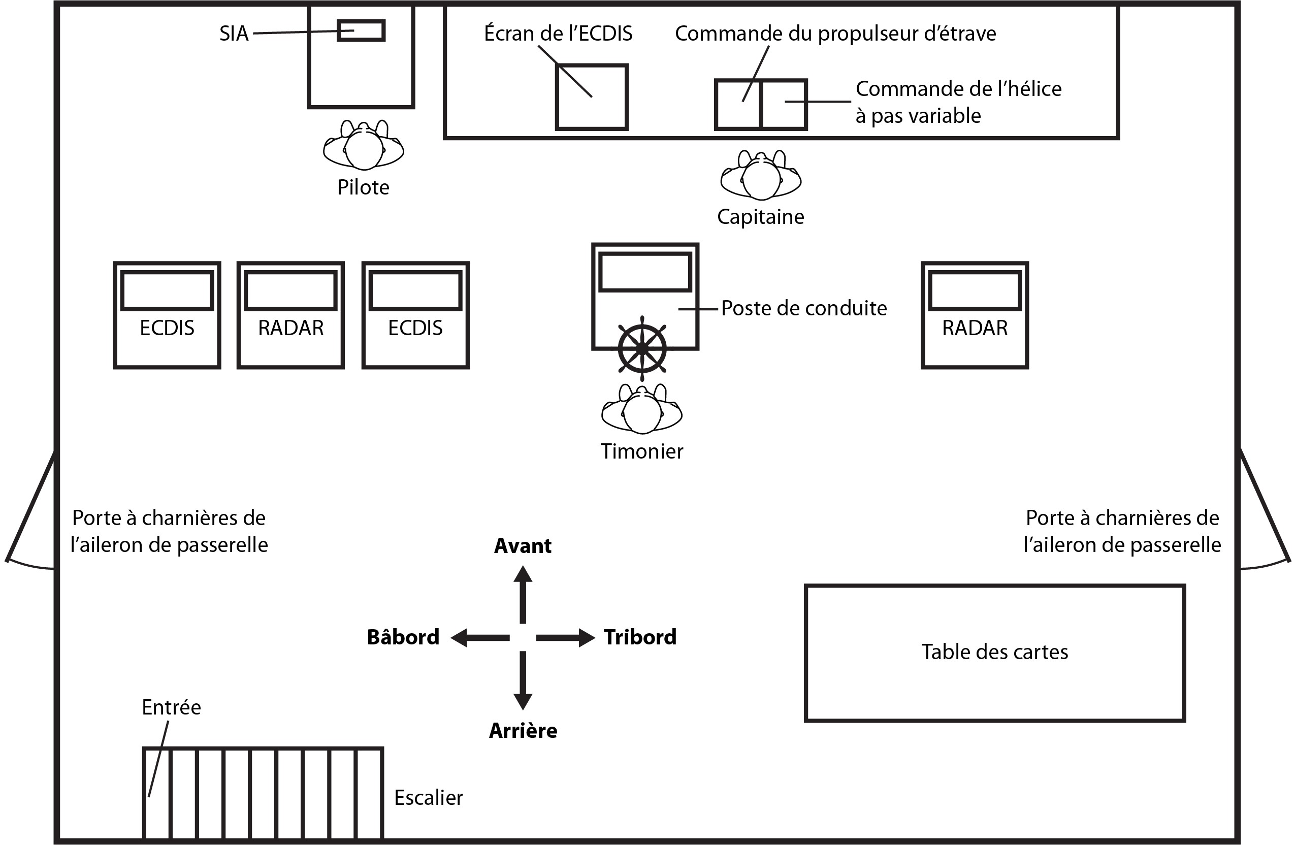 Avant d’entamer l’approche du poste d’amarrage no 53, le pilote était installé au poste du SIA, face aux fenêtres de la passerelle, et surveillait son UPP. Il a donné des ordres à la barre à l’intention du timonier et des ordres de propulsion au capitaine. Le timonier était à la barre, et le capitaine manipulait les commandes de propulsion et du propulseur d’étrave (figure 3). De sa position, le capitaine était en mesure de voir l’écran de l’ECDIS.