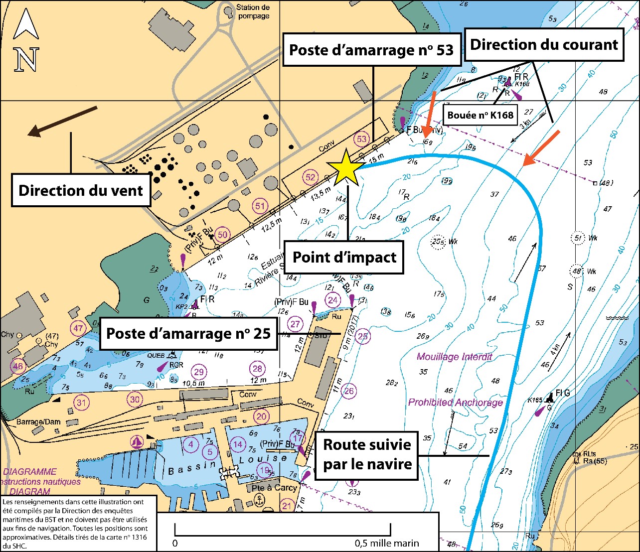 Le navire s’est approché du poste d’amarrage à vitesse réduite, mais sa progression a été affectée par l’effet combiné du courant sud-ouest et du vent est-nord-est, qui a poussé le navire vers l’avant.