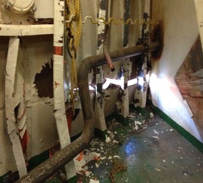 - déformation de la citerne de ballast no 2, 850 cm au-dessus du fond de la citerne, entre les couples 166 et 175;