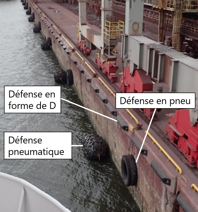 Le quai est muni de 3 types de défenses en caoutchouc différents. Les défenses sont conçues pour absorber l’énergie transférée d’un navire à un quai, protégeant ainsi la coque du navire et la structure du quai. Le système de défense du poste d’amarrage (figure 7) comprend ce qui suit :