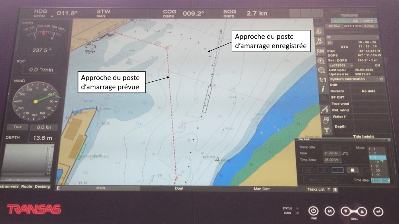 À 7 h 41, l’avant tribord du navire est passé par le travers du coin du poste d’amarrage no 53. Le navire a continué à virer lentement vers bâbord en s’approchant du quai à une vitesse de 3,2 nœuds. Il était positionné de telle sorte que la partie avant du navire était alignée avec le quai, tandis que la partie arrière dépassait le quai.