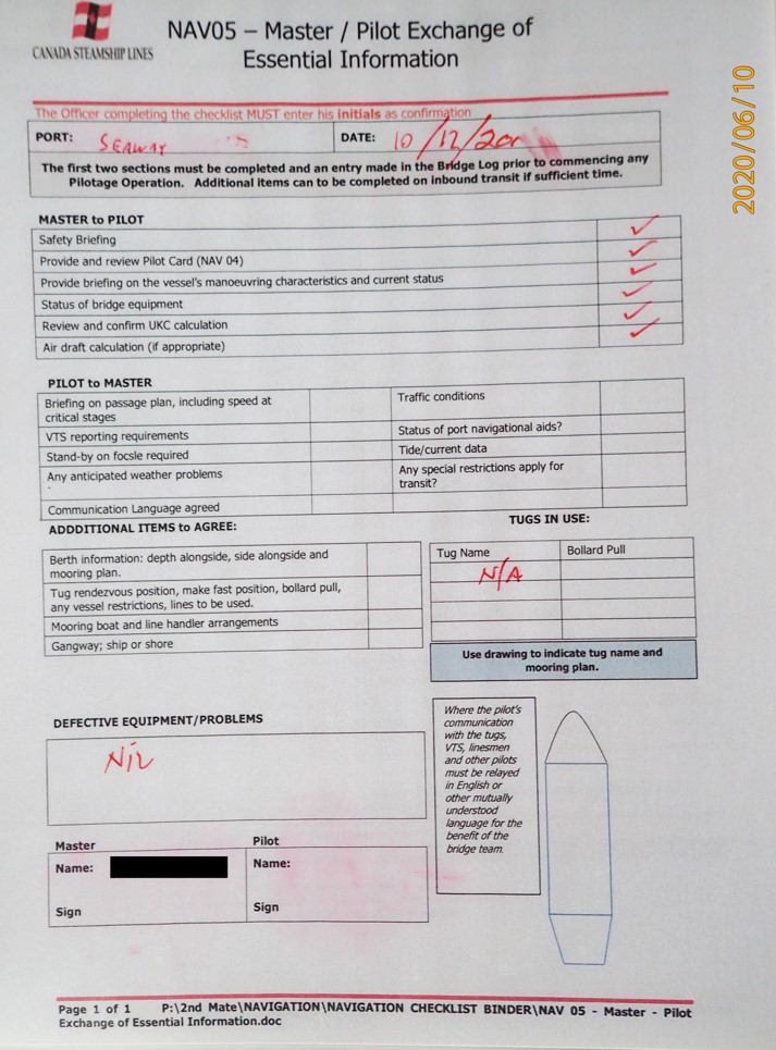 Annexe B – Exemple de liste de vérification pour l’échange de renseignements essentiels entre le capitaine et le pilote de la Canada Steamship Lines (en anglais seulement)