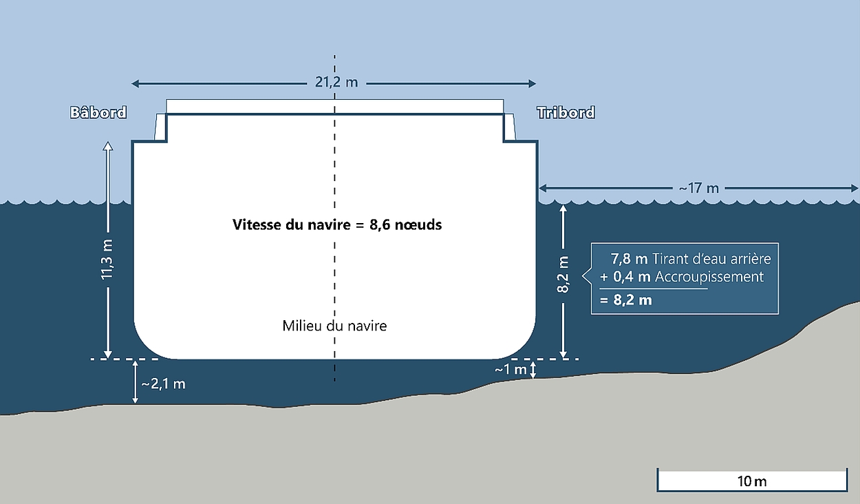 - Après que le Florence Spirit a modifié sa trajectoire de 4° pour refléter les changements de cap de l’Alanis, il a maintenu une trajectoire qui l’a mené près de la berge à une vitesse élevée, ce qui a accru les effets hydrodynamiques agissant sur le navire.