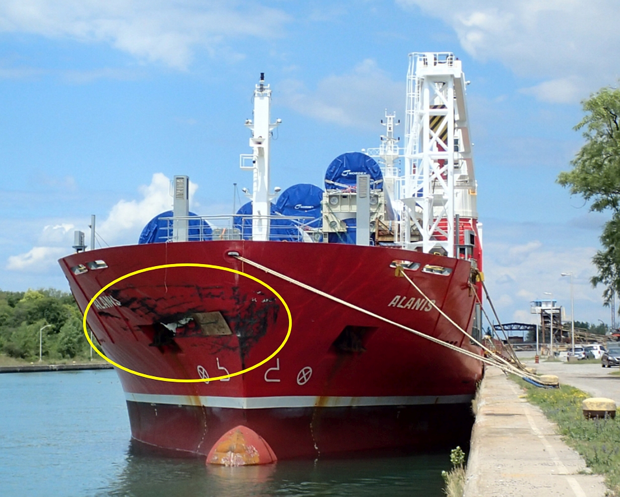 Le Florence Spirit a subi des dommages à la partie avant tribord de la coque (figure 9). Le gaillard d’avant, le bordé extérieur de la coque à tribord et la structure interne connexe ont été déformés et fissurés. La coque a été perforée, et une citerne de ballast et une cale à marchandises ont été percées et partiellement inondées. Les pavois avant, les garde-corps, les évents et la tuyauterie ont également été endommagés.