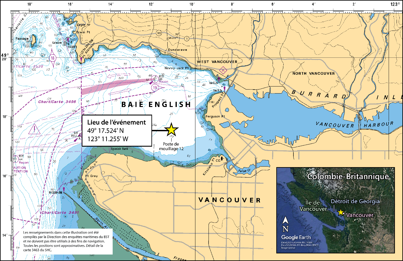 Le 1er décembre 2020, alors que le Blue Bosporus se trouvait au poste de mouillage 12 dans la baie English (Colombie-Britannique) (annexe A), un exercice d’embarcation de sauvetage était prévu conformément au calendrier des exercices du navire. Pendant l’exercice, l’embarcation de sauvetage devait être abaissée et mise à l’eau à l’aide du bossoir et être soumise à un essai de fonctionnement.