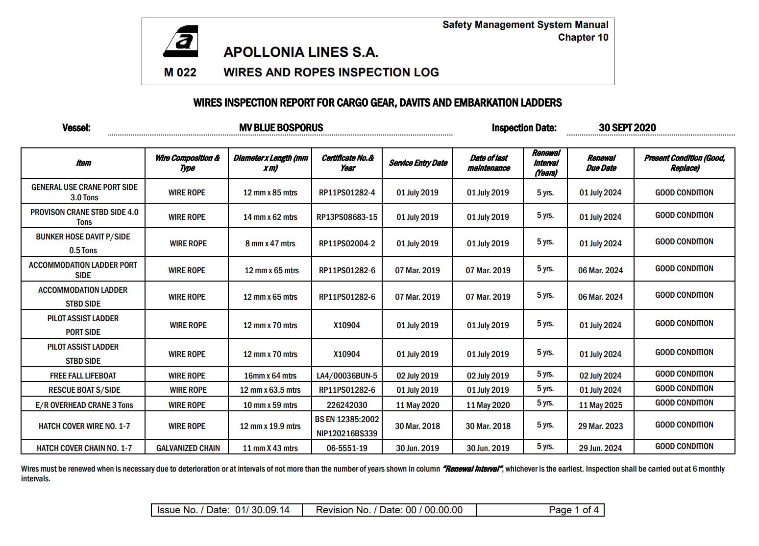 Apollonia Lines S.A. avait dans son SGS une section sur l’entretien, la maintenance et les essais des embarcations de sauvetage, des engins de mise à l’eau et des dispositifs de largage en charge. On y trouvait des listes de contrôle génériques pour les routines d’entretien à effectuer chaque semaine, chaque mois, chaque trimestre, chaque semestre, chaque année et tous les 5 ans. Les listes de contrôle pour les routines d’entretien planifié étaient effectuées en fonction des besoins par l’équipage du navire et le personnel à terre sur le Blue Bosporus. À l’exception de la liste de contrôle semestrielle, qui comprenait un point exigeant la vérification de tous les câbles et cordages de l’embarcation de sauvetage, aucune des listes de contrôle de l’entretien planifié ne demandait expressément à l’équipage de vérifier l’état des élingues.