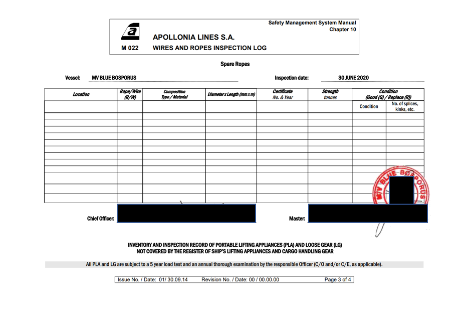 - Elle a inclus l’ensemble d’élingues de l’embarcation de sauvetage dans le journal d’inspection des câbles et cordages du Blue Bosporus.