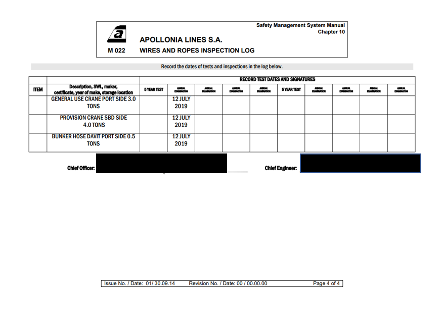 Apollonia Lines S.A. disposait d’un journal d’inspection des câbles et cordages pour consigner les principaux renseignements sur la sécurité de l’équipement de levage du navire, notamment la date d’entrée en service, les intervalles de renouvellement et les dates de renouvellement. Toutefois, les élingues n’étaient pas incluses dans ce journal. Même si, lors des vérifications internes à bord, on avait contrôlé les registres d’inspection et d’essai réguliers de divers appareils de levage à bord, on n’a pas cherché à s’assurer que chaque appareil de levage du navire était consigné dans le journal d’inspection des câbles et cordages. En l’absence de documents du navire concernant les élingues, il n’a pas été possible de déterminer depuis combien de temps les élingues étaient utilisées.