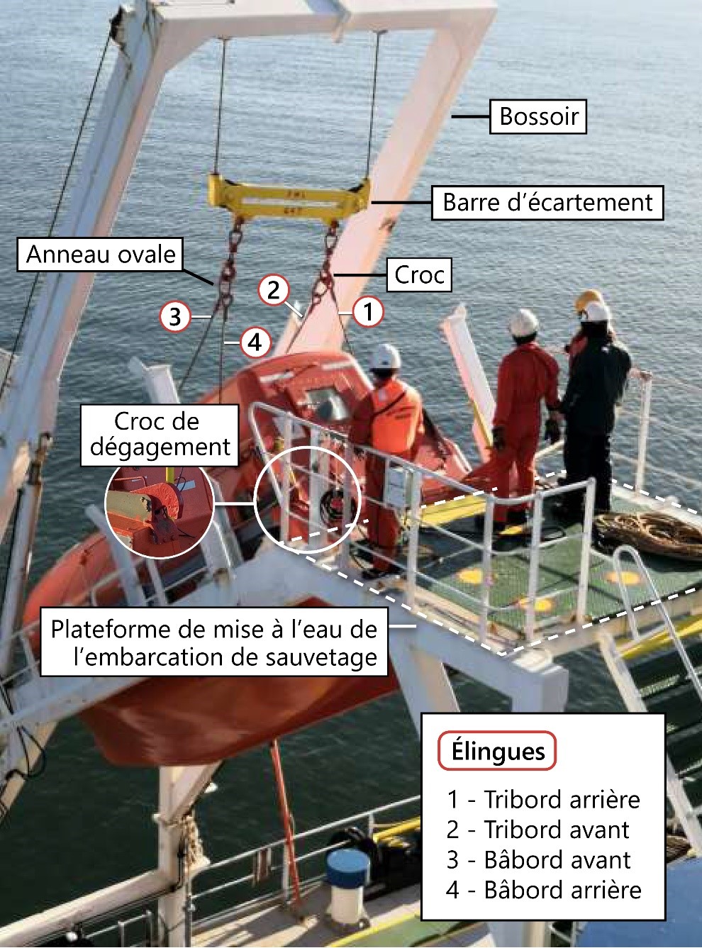 L’embarcation de sauvetage peut également être abaissée et récupérée à l’aide d’un bossoir. Le bossoir est généralement utilisé pour abaisser l’embarcation de sauvetage pendant les exercices et les essais. Au moment de l’événement, il servait à abaisser l’embarcation de sauvetage.