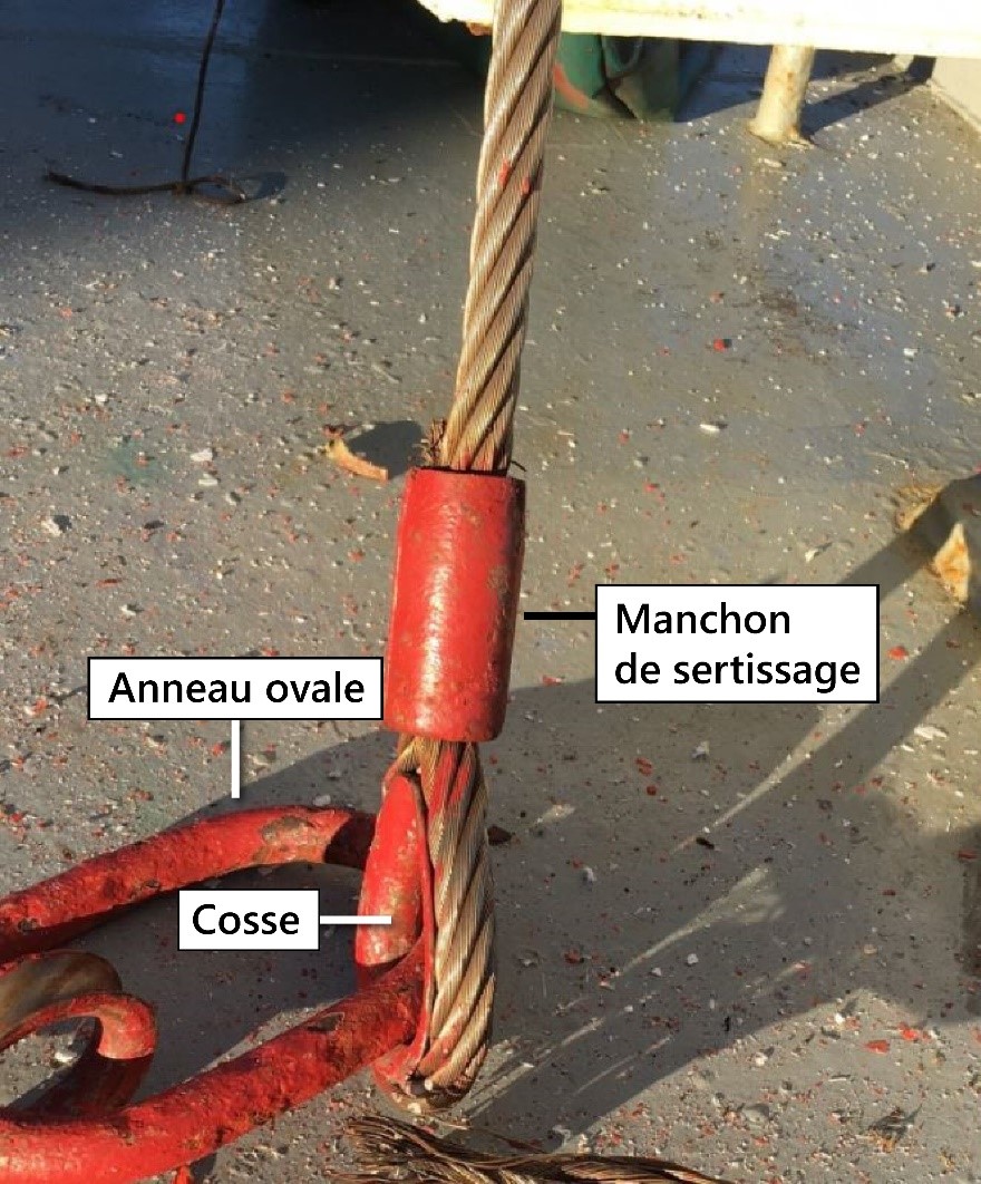 Le manchon de sertissage situé à l’extrémité supérieure de l’élingue tribord arrière s’est rompu, et le câble métallique s’est détaché de la cosse (figure 7). Une partie du manchon de sertissage brisé a été récupérée. Il était fendu en deux.