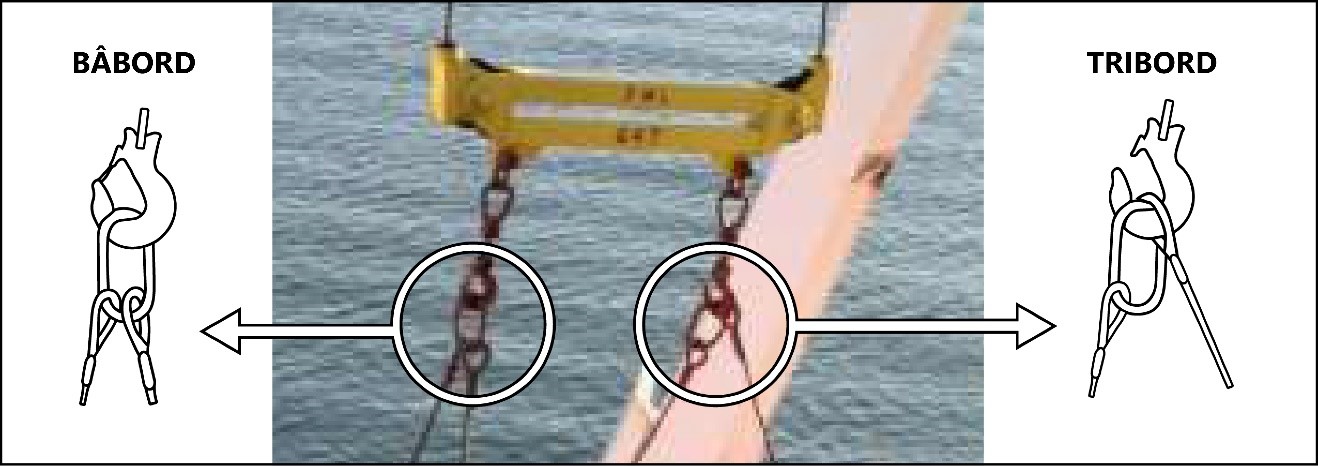 Les élingues étaient censées être fixées aux crocs de façon à ce que l’effet de choc créé par le largage de l’embarcation de sauvetage soit absorbé par les 4 élingues de manière à peu près égale.