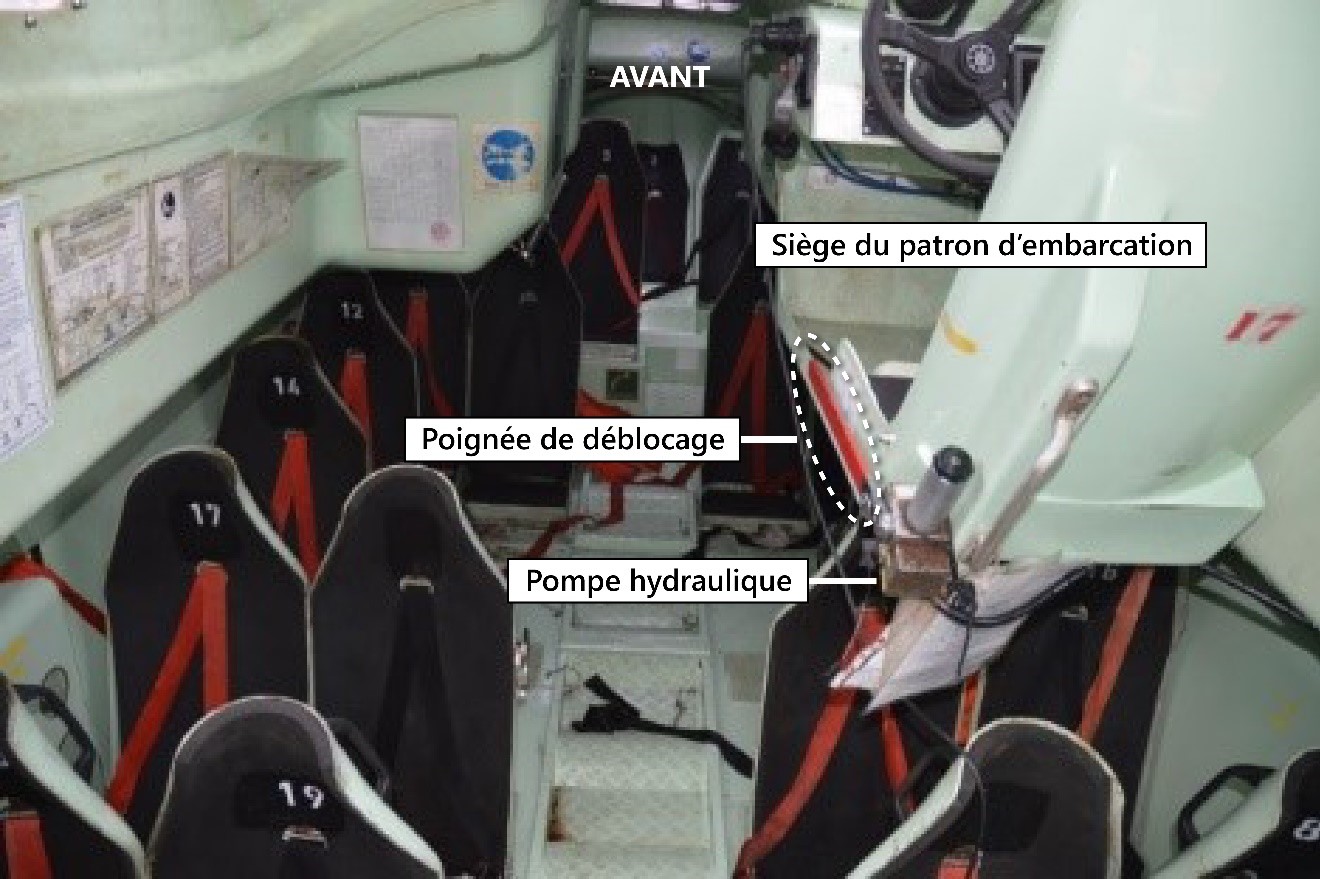 Le troisième officier est entré dans l’embarcation de sauvetage et s’est tenu debout à côté du siège du patron d’embarcation, faisant face à l’étrave de l’embarcation. Il a ensuite déplacé la poignée de déblocage de haut en bas de 8 à 10 fois afin de faire monter la pression hydraulique nécessaire pour déverrouiller le croc de dégagement (figure 5).
