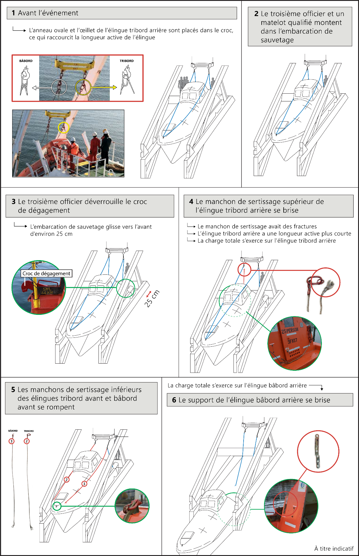 - En raison de la manière dont les élingues étaient fixées aux crocs, la charge s’est concentrée sur l’élingue tribord arrière. Ceci, combiné aux manchons de sertissage affaiblis, a provoqué la rupture séquentielle des élingues et du support d’élingue bâbord arrière.